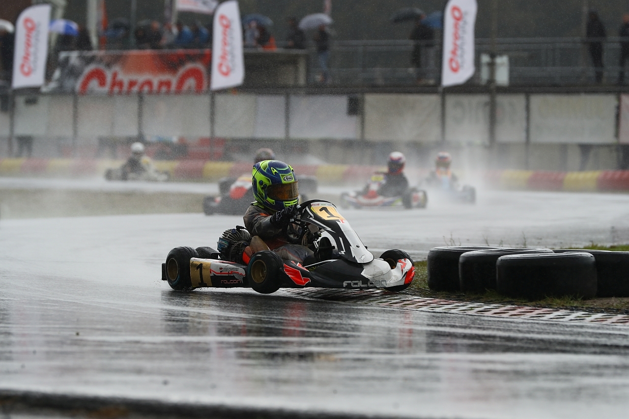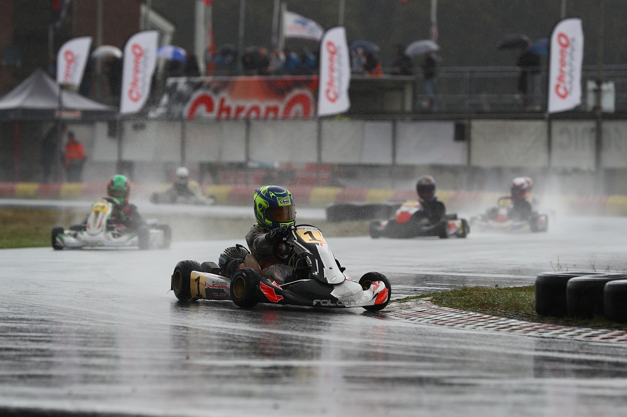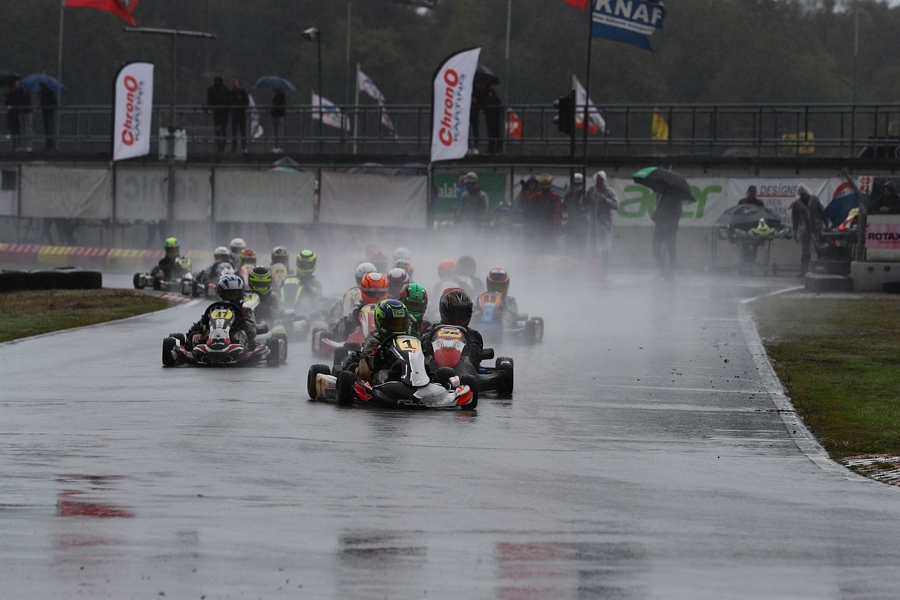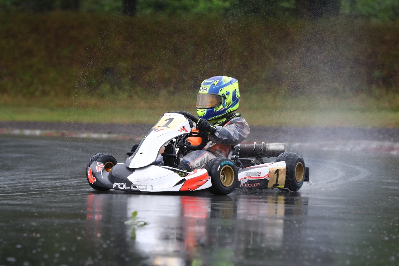 De derde race was nog even spannend want de baan was al aan het opdrogen, met een iets veranderde kartafstelling ben ik begonnen aan de race, bij de start kon ik meteen twee posities pakken en heb lang op positie vier gereden. Uiteindelijk kon ik inlopen op coureurs voor me en in ronde acht lag ik op positie een en deze heb ik ook niet meer afgegeven.